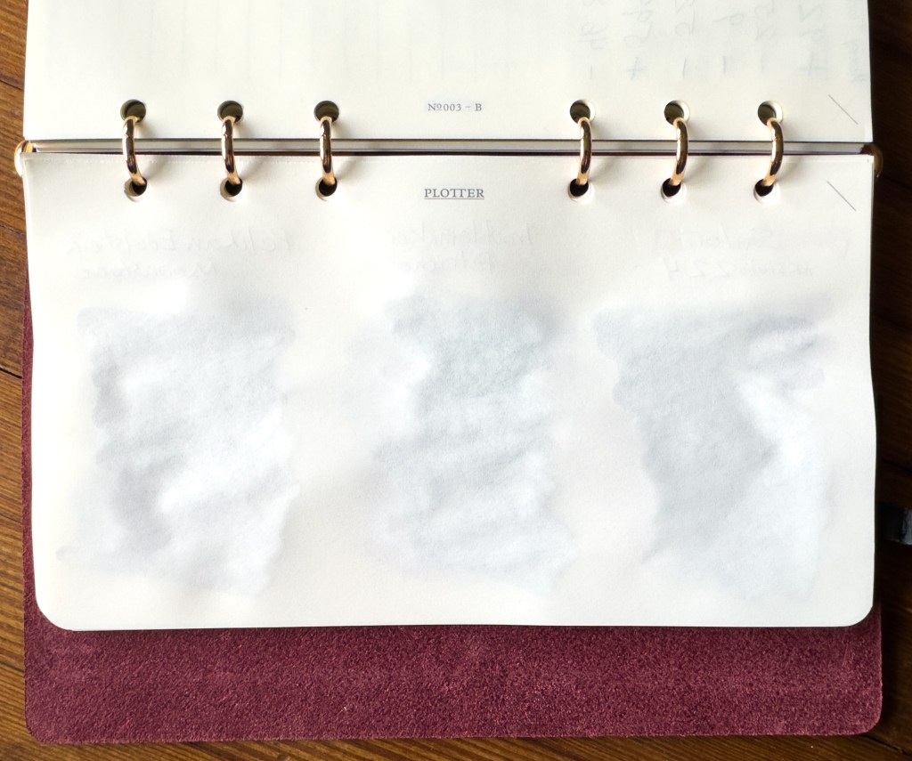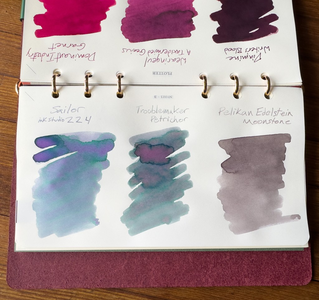 The inks are from two brands that I have been hearing a lot about lately so I thought I’d check them out. Since I will never need ink again I ended up shopping based off names. I brought home Troublemaker Petrichor and Wearingeul A Taxidermied Genius. The former is an interesting almost pencil-like grey-silver with hints of pink and purple hidden in deeper pockets, the latter is a deep wine red with a sparse green sheen.