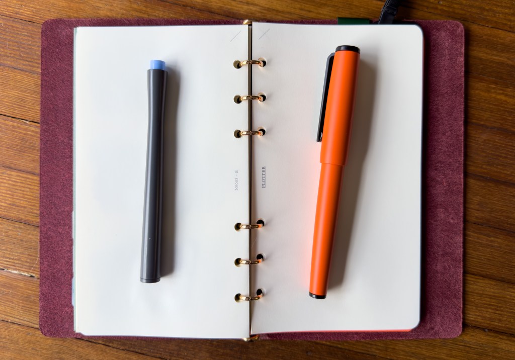I was surprisingly restrained at the pen show, taking home only one fountain pen, two inks, and a dip pen. The fountain pen is a Karas Pen Co. Hunter Orange Decograph. As a multi-Karas pen-haver, I’ve had my eye on the Decograph line for a while but never actually picked one up. Well, I could resist the call no longer, and this bright orange Cerakote finish just really caught my eye. The Decograph is Karas’ take on a traditionally sized and shaped US-style fountain pen. It uses a Bock #6 nib and standard international cartridges, and was machine-made of solid 6061 aluminum.